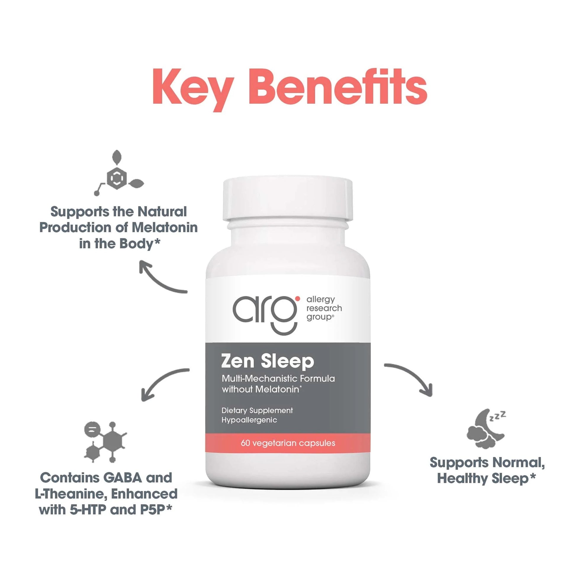 Zen Sleep es un suplemento de alta pureza desarrollado por Allergy Research Group que incorpora los ingredientes clave del producto Zen clásico, reforzado con 5-HTP para mejorar la calidad del sueño. Contiene GABA, L-teanina y 5-HTP, todos ellos relacionados con la modulación del sistema nervioso y la síntesis de serotonina y melatonina, junto con vitamina B6 activa para facilitar estos procesos.